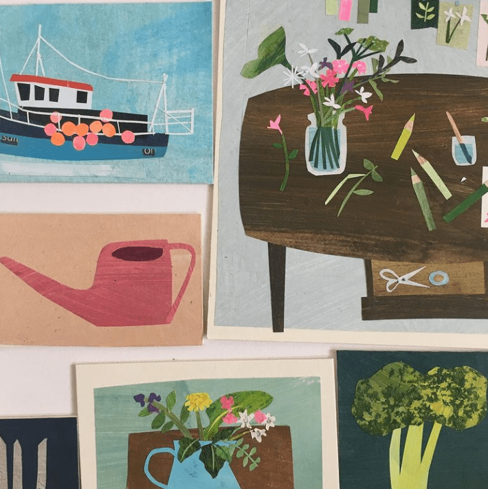 Clover’s collages, or ‘snips’ are created by colouring, cutting, and layering tiny pieces of paper. Works are jaunty, detailed, and highly illustrative. A selection of eco-friendly cards and prints are available here. Originals sell in seconds, so make sure you keep an eye on shop updates!