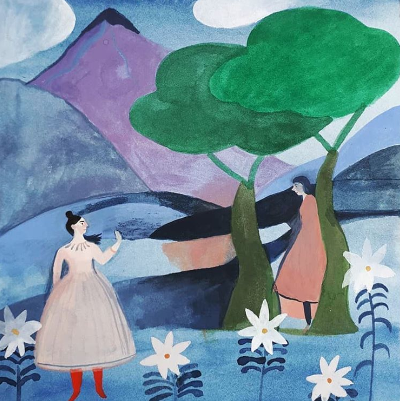 Melodie’s work focuses largely on portraits of female figures, curious landscapes, and scenes reminiscent of folk and fairytales. Her landscapes in particular are both strange and familiar, sitting somewhere between the imagined and the real. See more of Melodie’s work here.